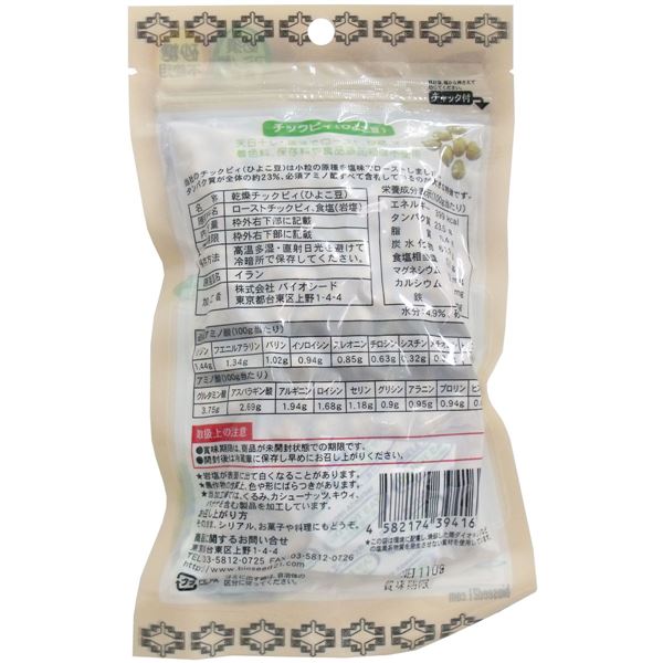 【名称】乾燥チックピィ(ひよこ豆)【原材料】ローストチックピィ、食塩(岩塩)【保存方法】直射日光・高温多湿を避けて冷暗所で保存してください。