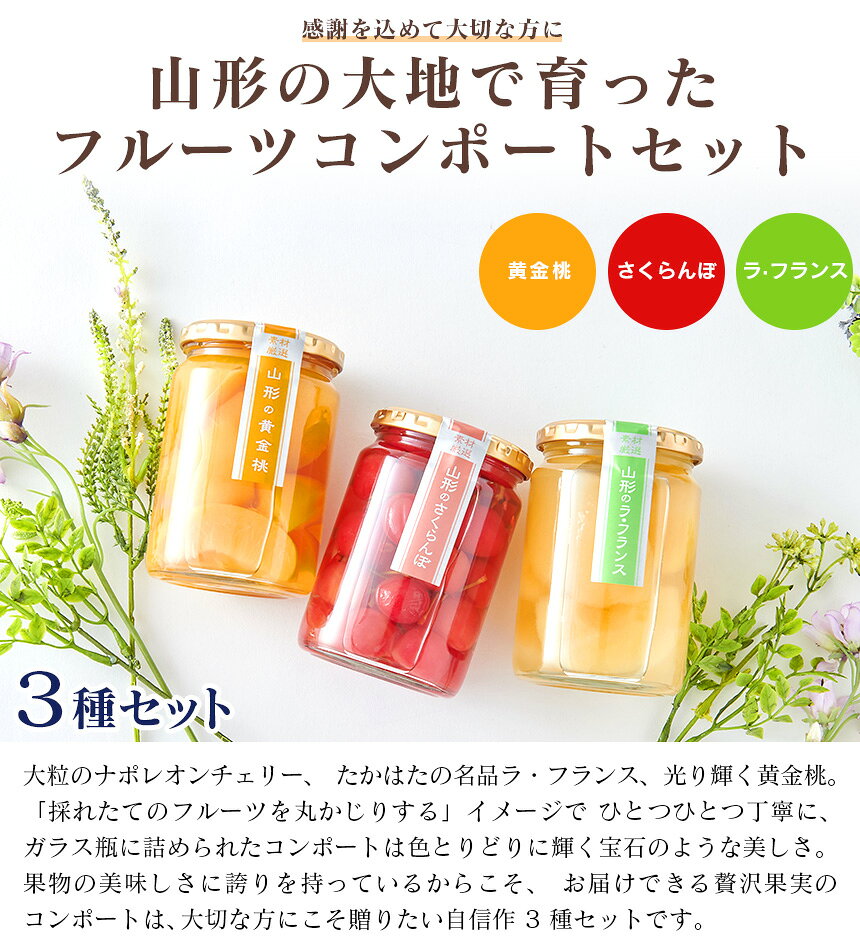 山形産の厳選素材を用いた、さくらんぼ、黄金桃、ラ・フランスを使用したフルーツコンポートの3本セット。