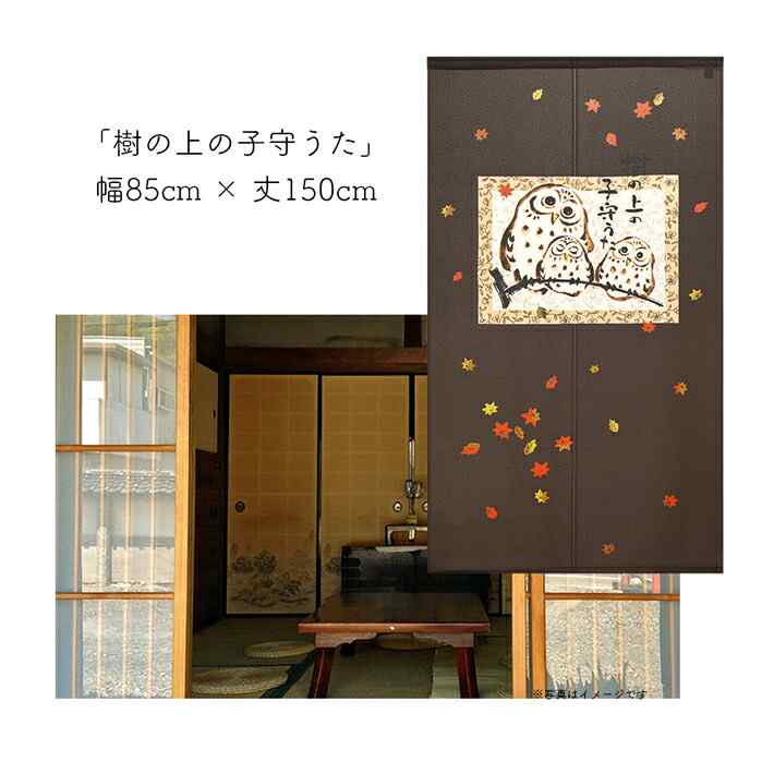 【P2倍&300円OFFクーポン配布中】のれん 樹の上の子守うた 【受注生産】 85cm幅 150cm丈 おしゃれ 和風 秋 ブラック ふくろう もみじ 縁起物 転写 gs