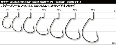 ※ちなみに「SaqSas」の語源は「サクッと刺す」からくる造語 (商品パッケージより) EWOS【エキストラワイドオフセット】 バルキーなワームにマッチする、ワイドタイプのオフセットフック。