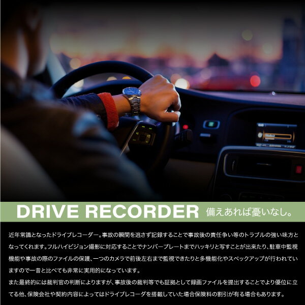 商品内容■広角スリムタイプ2.7インチドライブレコーダー商品詳細■モニターサイズ:2.7インチ/16:9ワイドモニター■製品サイズ:幅110mm×高さ43mm×奥行き26mm■重量:約85g■電源:DC12v〜24v/シガー電源×ミニUSB■画像解像度:1080P/720P/WVGA/VGA/QVGA■ドライブレコーダー機能■静止画撮影機能■ファイルビューアー機能■フレームレート:30FPS■ファイル形式:動画/MOV・静止画/JPG■対応メディア:マイクロSDHCカード/8〜32GB/クラス10以上■事故時にファイルを保護するGセンサー■駐車時に振動を感知し録画を開始するパーキングセンサー■センサー感度は高/中/低/無効から選択可■露出設定:-2.0〜+2.0■自動電源オン・自動スクリーンオフ機能■デイデイト機能■日本語・英語・中国語対応*お届け時バッテリー残量が少なくなっています。
