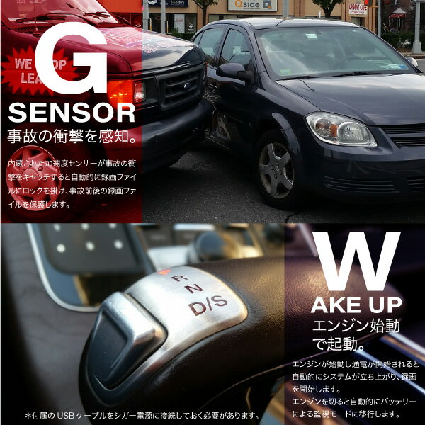 事故の衝撃を感知して事故前後のファイルを保護する「Gセンサー」、駐車時も振動を感知し撮影を開始する「パーキングセンサー」、明るさを自動的に修正する「HDR」等必須機能を搭載。