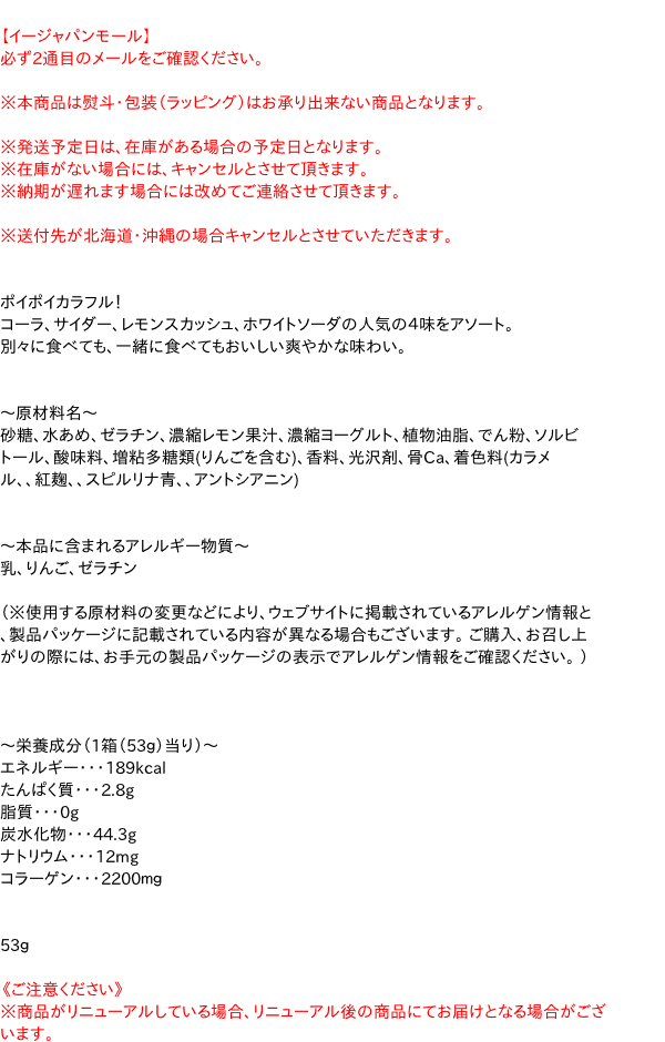 ) 〜栄養成分(1箱(53g)当り)〜 エネルギー・・・189kcal たんぱく質・・・2.8g 脂質・・・0g 炭水化物・・・44.3g ナトリウム・・・12mg コラーゲン・・・2200mg 53g【広告文責】株式会社イージャパンアンドカンパニーズ 072-875-6666《ご注意ください》 ※商品がリニューアルしている場合、リニューアル後の商品にてお届けとなる場合がございます。