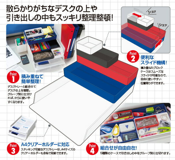 カラー:ホワイトサイズ:本体:外寸/H35×W152×D239mm、内寸/H30×W146×D23mm材質:ABS樹脂 厚み3.0mmデスクトレーと組み合わせてスタッキング、スライドしてご使用できるブロックケースA4サイズの書類を収納できます。