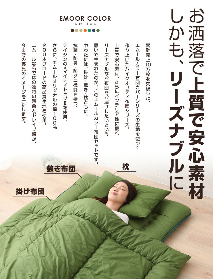 生地は光沢がありなめらかな綿100% 200本ブロード、中わたは抗菌防臭・防ダニわたを使用した、機能も品質も安心の寝具セットです。