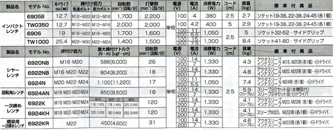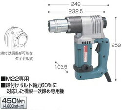 いつでもお買い得! ■締付けボルト軸力60%に対応した橋梁一次締め専用機!■M22専用■締付け調整が可能なダイヤル式【主要機能】 締付け能力 最大締付けトルク (N・m)[kgf・cm] M22 450[4600] 回転数 (min-1) [回転/分] 電源 (V) 電流 (A) 消費電力 (W) 31 単相100/200 14/7 1330 コード (m) 本機寸法 (mm) 質量 (kg) 標準付属品 2.5 高さ259x幅249 4.6 (スリーブなし) アウタスリーブ インナスリーブ M20、M22用各1個 マイナスドライバ