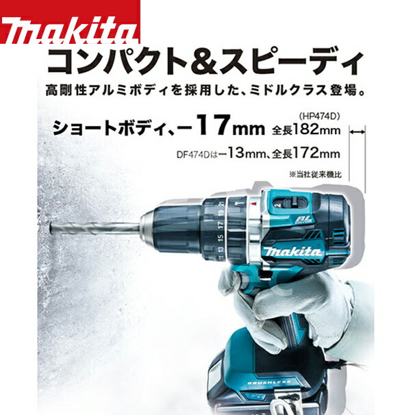 充電式震動ドライバドリル HP484DRGX ・18V/6.0Ah ・全長 116mm ・最大締付トルク 60N・m ・質量(kg)1.8(バッテリ含む) ・標準付属品 プラスビット2-65・フック・バッテリBL1860BX2本・充電器DC18RC・ケース付 ・約55分充電