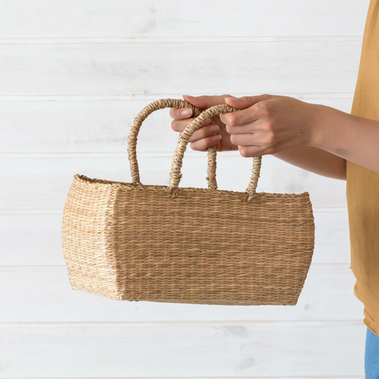 同梱について 雑貨同士のみ同梱可能シーグラスで編まれた トート型かごバスケット シーグラス(天然水草)を、職人の手作業で丁寧に編みこんで作られた ベトナム生まれのトート型バスケット。