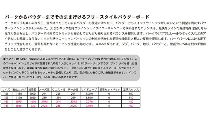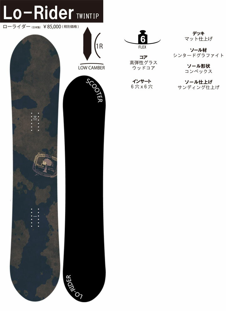 ブランド:SCOOTER スクーター モデル:Lo-Rider ローライダー 形状:ローキャンバー シェイプ:ツインチップ ※レビューを記載いただける場合商品到着後のレビューの記載をお願い致します 注意事項:カタログ画像に関して、カラー・デザイン・仕様等は予告なく変更になる場合がございますので予めご了承下さい。