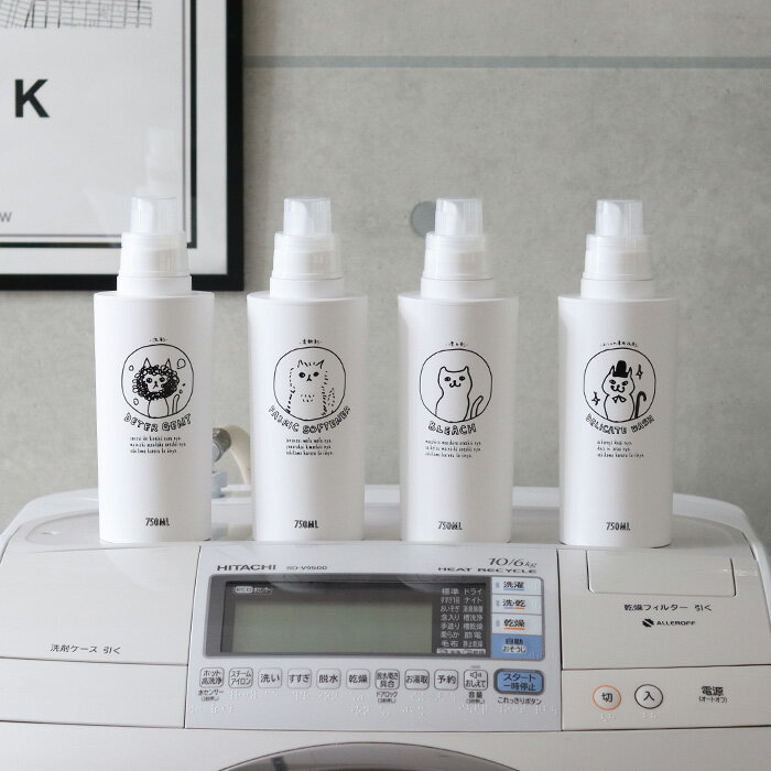 出し入れの手間と共に、たちまち、洗濯機周りを可愛くオシャレな空間に仕上げてるのではないでしょうか! この爽やかなホワイトのボトルに描かれたゴキゲンなネコちゃん達が、私たちのお洗濯を応援してくれます。