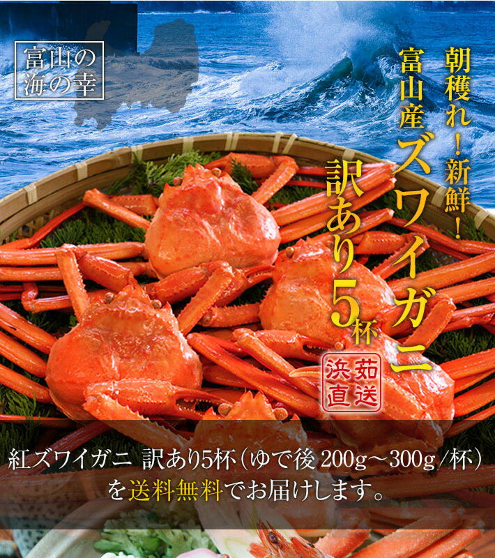 【送料無料★未冷凍】紅ズワイガニ 訳有5杯(ゆで後200g〜300g/杯) 朝獲れ新鮮 ボイル 姿蟹 滑川産地より直送◆茹で蟹/蟹/かに/カニ/紅ズワイ/ベニズワイガニ/ベニズワイ/日本海の紅ズワイガニ/富山の紅ずわいがに【#元気いただきますプロジェクト】