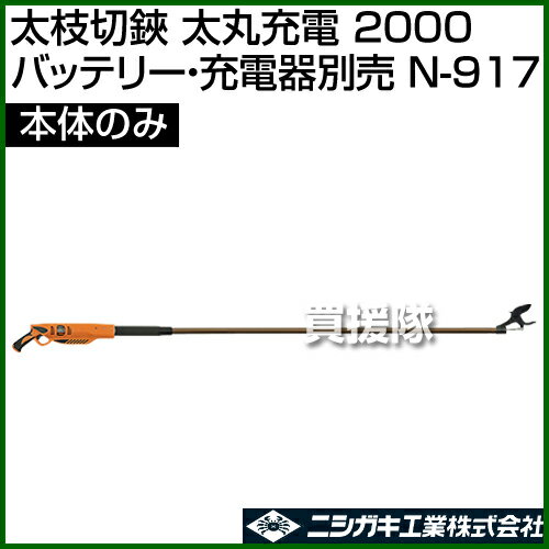 納期について:メーカー直送品(代引き不可) 【ハサミ 鋏 はさみ 高枝鋏 植木 植え木 植えき 街路樹 果樹 剪定 電動 充電式 枝払い 枝打ち】 太枝を瞬間切断! 【主な用途】果樹、一般枝切りなどに 仕様 メーカー ニシガキ 品名 太枝切鋏 太丸充電 2000 [本体のみ/バッテリー・充電器別売] 品番 N-917 JANコード 4964590910070 本体サイズ(全長×全高×全幅) 約56×2000×162mm 重量 約2.46kg コード長 1300mm モーター定格電圧 DC14.4V モーター定格消費電力 264W 最大切断径 生木 約40mm 切断速度 約2秒/1サイクル 満充電時の切断本数 切断枝径 生木40mm(約900本)、切断枝径 生木15mm(約2000本) 材質 刃/高級刃物鋼、本体/ABS樹脂、パイプ/アルミ合金 原産国 日本国 ※当商品は、バッテリー・充電器が付属しておりません。