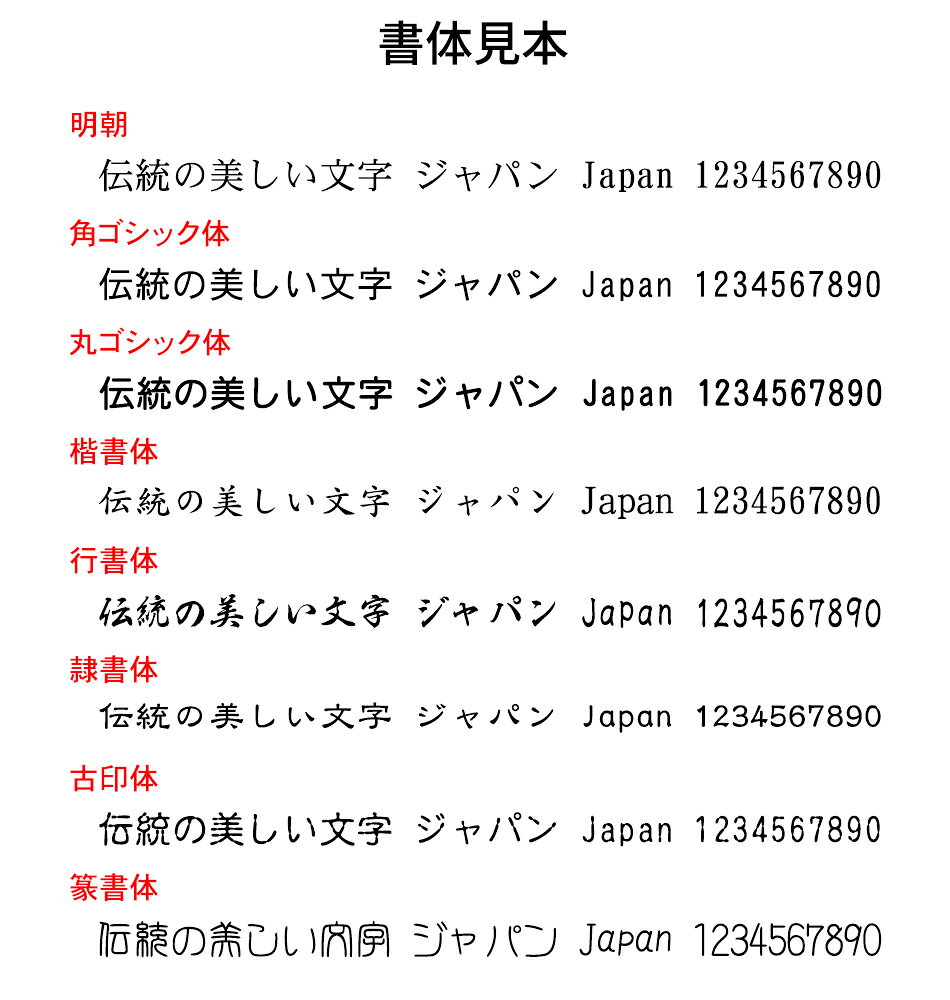 明朝体(みんちょうたい)、角ゴシック(かくごしっく)、丸ゴシック(まるごしっく)、楷書体(かいしょたい)、行書体(ぎょうしょたい)、隷書体(れいしょたい)、古印体(こいんたい)、篆書体(てんしょたい)。